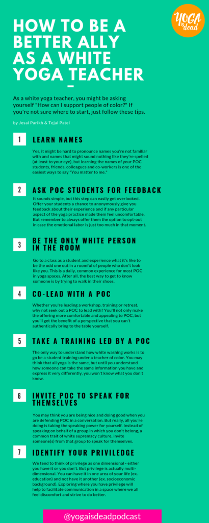 If you’re looking for an immersive spiritual experience, this ain’t it. CorePower is a big-box franchise with studios in 24 states. They have 28 studios in Colorado alone! There’s a new podcast called Yoga is Dead. Yoga is Dead is a revolutionary podcast that explores power, privilege, fair pay, harassment, race, cultural appropriation and capitalism in the yoga and wellness worlds from Indian-American hosts Tejal + Jesal. Their first episode is titled White Women Killed Yoga. I can’t help but think this studio is exactly what they are referencing. I’m attaching some of their tips on allyship here (cause y’all need it).