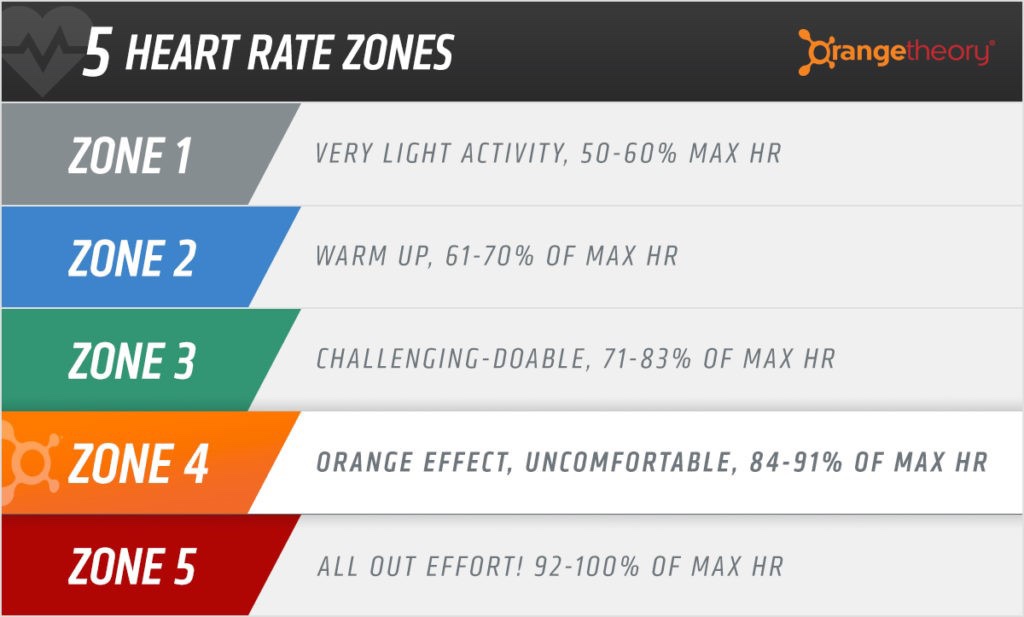 Your first workout is free! I wasn’t getting out of it so my friend called to reserve my spot the morning of, heads up – they do ask for a card to keep on file. When you arrive at OTF for your first class, they sit you down with one of their staff members to give you a tour and briefly describe their methodology. I was a little less anxious after they said that while you are striving to spend most of your workout in the blue and green heart rate zones, it’s totally normal to see more of a variation and everyone is different. Here’s a graphic they showed us on the heart rate zones before class.